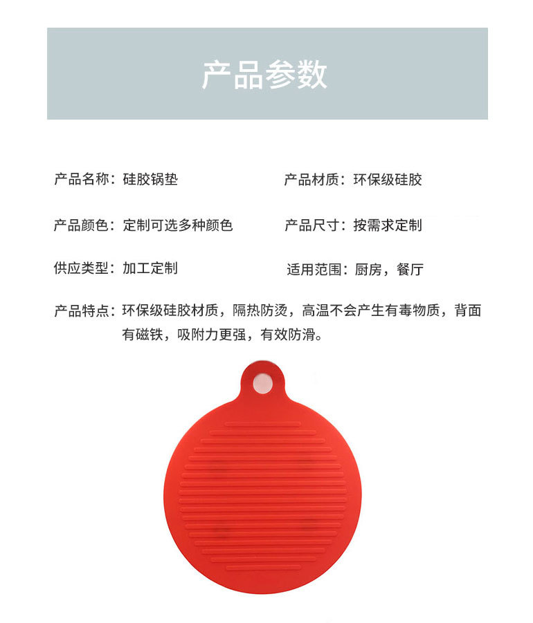 您的位置:首頁(yè) > 產(chǎn)品中心 > 硅膠廚具用品 > 餐墊 > 硅膠餐墊定制,帶磁鐵硅膠隔熱鍋墊