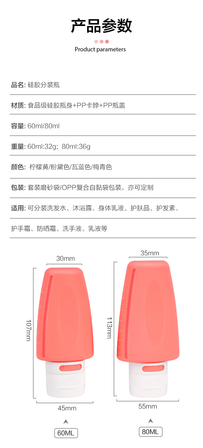 適用: 可分裝洗發(fā)水、沐浴露、身體乳液、護(hù)膚品、護(hù)發(fā)素、